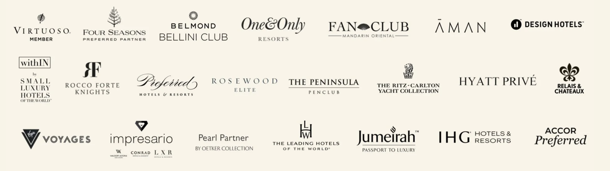 We partner with nearly 6,000 hotel properties around the world — including Four Seasons Preferred Partners, Rosewood, Virtuoso, and beyond— to ensure you get treated like a VIP wherever you travel to next. Some of our top hotel partners are featured below: